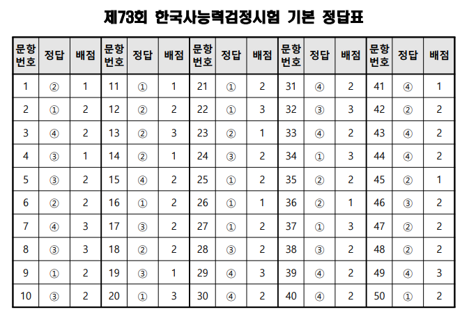 제73회 한국사능력검정시험 기본 기출 문제 및 정답 공식 자료 ☝